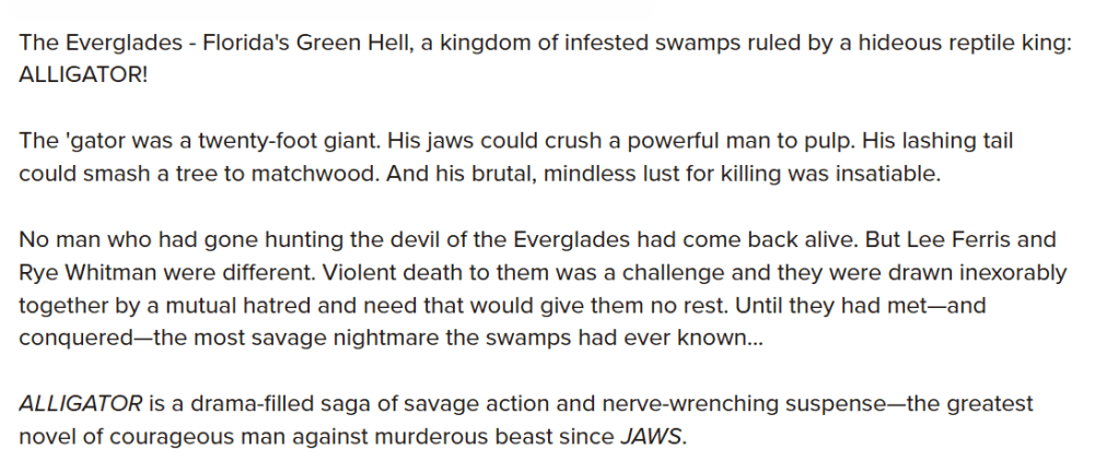 For me, the book leaned more on symbolism than true horror. While that can be effective, I was hoping for something closer to Jaws: a relentless predator stalking its victims. Instead, the novel focuses on two men hunting the alligator, which lessened the fear factor. I would never put myself in that spot. I have seen a lot of horror related movies and tv shows. I find that horror for me, works better when characters are trapped in situations beyond their control.